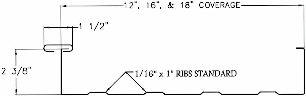 T-Rib Panels feature a 2½-inch high seam with a ½-inch top flange angled at 90 degrees, providing exceptional structural stability. Available in 12", 14", 16", or 18" widths, these panels accommodate various architectural and functional needs. Additionally, 1/16" x 1" stiffening ribs in the panel pans enhance rigidity, reducing oil canning and improving overall panel performance.